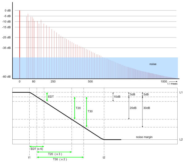To get comparable values all four measurements are multiplied with the appropriate factor to match the historically constituted RT60 (decay of 60 dB).