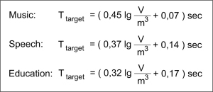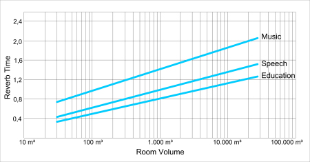 The German standard DIN 18041 ("acoustical quality in small to medium size rooms") recommends reverberation times for class rooms, meeting rooms and conference rooms. It was revised the last time in 2004. It corresponds to the Swiss standard SIA 181 and the Austrian standard Ö–NORM EN 12354-6 [3]. For a frequency range from 500Hz to 1kHz the following equations should be used to calculate appropriate reverberation times for fully occupied rooms: