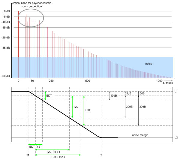 Two types of reverberation time are measured. One is EDT (Early Decay Time), the second is Reverberation Time RT as T10, T20 and T30.