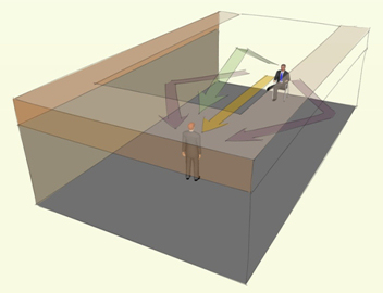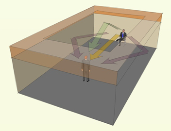 Sound absorption should be considered not only in one direction rectangular to the material's surface but from all possible directions as sound is reflected in a room to all directions and will hit the material from all different directions. For this reason the measurements of the absorption coefficient are taken in a special reverberation chamber that simulates real conditions during the test phase. A (relatively large) sample of the tested material will be put into the (also large) chamber. The chamber itself should have a very long reverberation time. From the measured difference between the empty chamber and the chamber with the sample material, the absorption can be calculated.