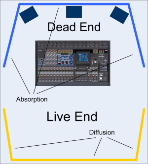 The Live End - Dead End concept is one of the older standards for control rooms of recording studios. The dead end of the room is the front side behind the rear of the control speakers and the live end is opposite wall of the room, the rear side of the listening position. Dead end means treatment of the wall surfaces with broadband absorptive materials that will absorb sound energy over the entire frequency band to a relatively high degree.