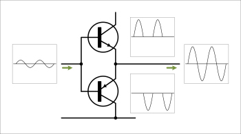 In a class A amplifier the input signal is amplified by one single circuit (transistor). The output signal is the exact image of the input signal. This technology is used today mostly for preamplifiers and other small signal amplification.