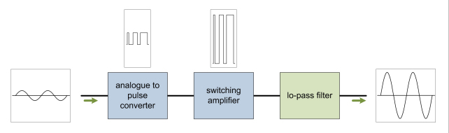 The Class D amplifier converts the input signal is a sequence of pulses, similar to a digital wave form but it is still an analogue signal. The length of the pulses is directly proportional to the signal amplitude.