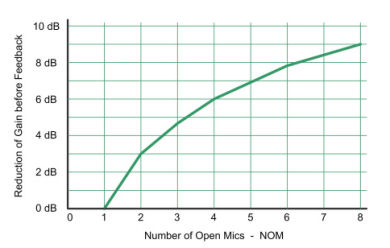 Every doubling of open microphones in a sound reinforcement system diminishes the gain before feedback by 3 dB because the sound energy increases by 3 dB (the transmitted energy of two sound sources with non-correlated signal compared to only one sound source is an increase of 3 dB).