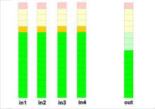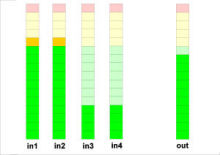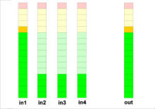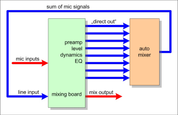 In live sound and broadcast applications (talk shows, interviews with many participants etc.) just an automatic microphone mixer can not deliver the necessary results. A often used and very well working arrangement is an auto mixer set-up as a loop-in in conjuction with the regular mixing board. All mic channels are treated as usual but fed into the auto mixer via the direct out outputs (setting: post fader!). Now the sum output of the auto mixer is fed back into the mixing board via one single input channel. All the necessary adjustments for the individual mic input channels will be done on the mixing board, just the handling of the often rapid change-over between 'open' and 'closed' mics originated by fast talking and interrupting persons is handled (un-audibly) by the auto mixer.