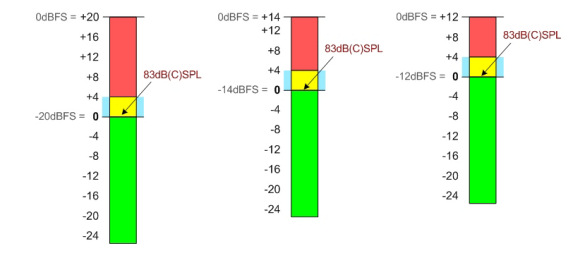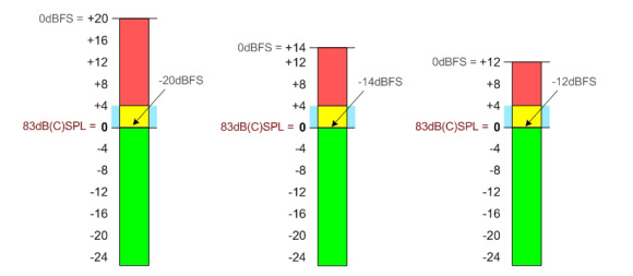 These three scales are different in their relationship to digital fullscale (0dBFS) and therefore in their implemented headroom: 0dB SPL(C) at either -20dBFS, -14dBFS, or -12dBFS (below fullscale).