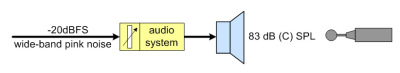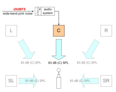 The system is fed with wide-band pink noise of -20dBFS, -14dBFS or -12dBFS (depending on the favored scale K-20, K-14, K-12). Every loudspeaker channel is adjusted individually to output 83dB SPL(C) 'slow'.