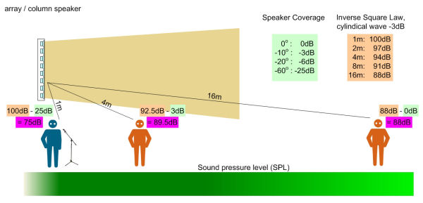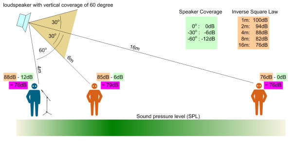 Using a regular loudspeaker with a vertical coverage of 60º, the following level distribution would be reached: