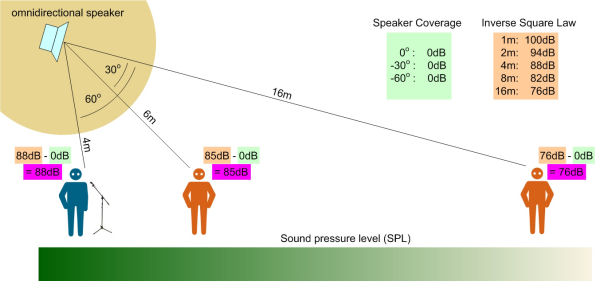 Using an omnidirectional loudspeaker sound distribution into all angles would be equal and the following level distribution would be reached: