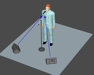 super cardioid mic in front of monitor wedges - minimum feedback (but don't move the mic!) |