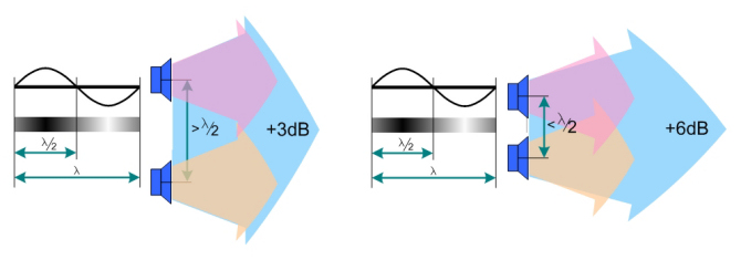 no mutual coupling with acoustic centers more than 1/2 wavelength separated | mutual coupling with acoustic centers less than 1/2 wavelength separated |