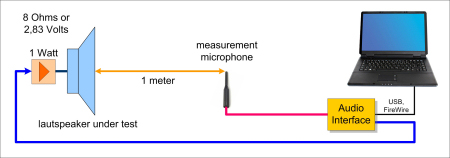 Sensitivity is the measure of the loudspeaker's ability to convert electrical power into sound energy. It is quoted by the resulting SPL in dB in a distance of 1 meter then the speaker is powered by 1 watt. Typically it is measured with a test tone of 1kHz. Normally the measurement microphone is placed one meter away from the loudspeaker to measure the sound output. For larger systems the measurement will be made in a larger distance and the result is re-calculated for 1 meter.
