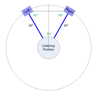 Two Stereo Loudspeakers are positioned each 30 degrees out of axis left and right to create an angle of 60 degrees between each other. The stereo speakers and the preferred listening position (the hot spot) create an equilateral triangle between Speaker L - Speaker R - Listener. The angle of 60 degrees is agreed between many professionals as the optimal listening angle. If spaced farther apart phantom images between the two speakers are not stable anymore.