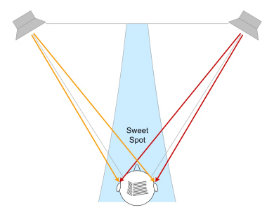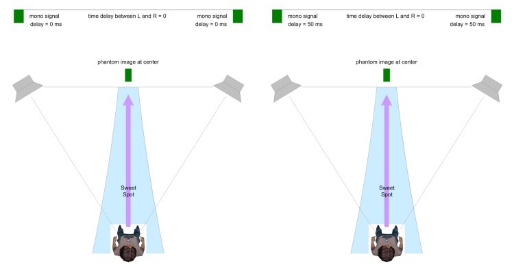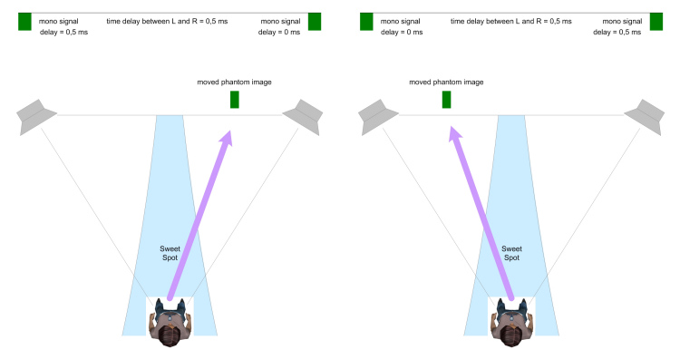 Additional to the delay received at both ears from one speaker, the general delay of the signal from the 'left' and the 'right' speaker is received and processed at the auditory system and brain. At the exact center point of the 'sweet spot' this delay is zero and both speaker's signals are received at the same time (right side image).