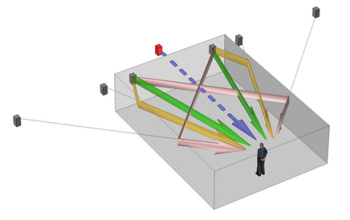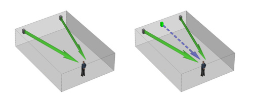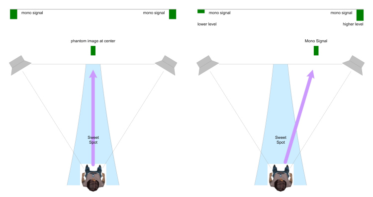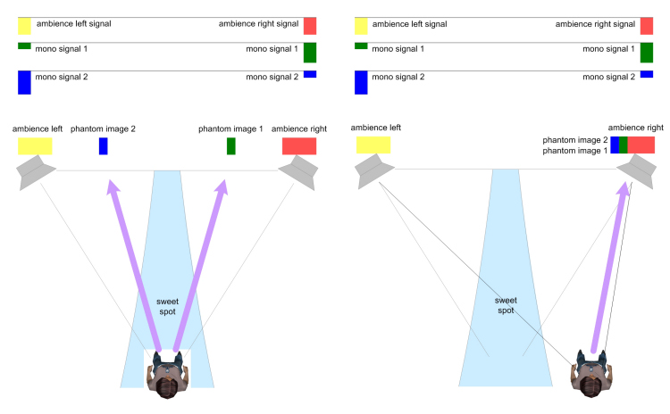left: level differences at the left and right channel create a moving phantom image, right: with the listener out of the 'sweet spot', the phantom image moves completely to the nearer speaker, but the images of 'pure' stereo signals (yellow and red) are unchanged |