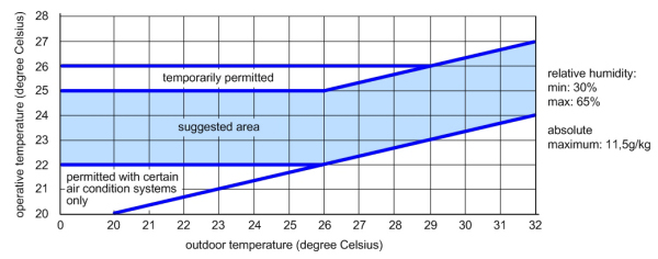 The room temperature range should be in winter 19 to 24 degrees Celsius with minimum 21 degrees at daytime and in summer 23 to 26 degrees Celsius with maximum 26 degrees at daytime. The temperature should be measured at a height of 0,6m above floor.